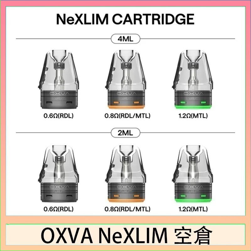 | OXVA NeXLIM空倉 | OXVA NeXLIM0.6空倉一盒3入2ML, OXVA NeXLIM0.6空倉一盒3入4ML, OXVA NeXLIM0.8空倉一盒3入2ML, OXVA NeXLIM0.8空倉一盒3入4ML, OXVA NeXLIM1.2空倉一盒3入2ML, OXVA NeXLIM1.2空倉一盒3入4ML |